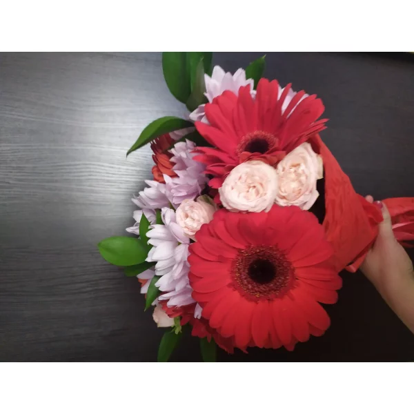Уменьшенный: Гербера красная/розовая/малиновая - 3 шт., хризантема белая кустовая - 1 шт., роза кустовая кремовая - 1 шт., салал - 2 шт., фетр красный.